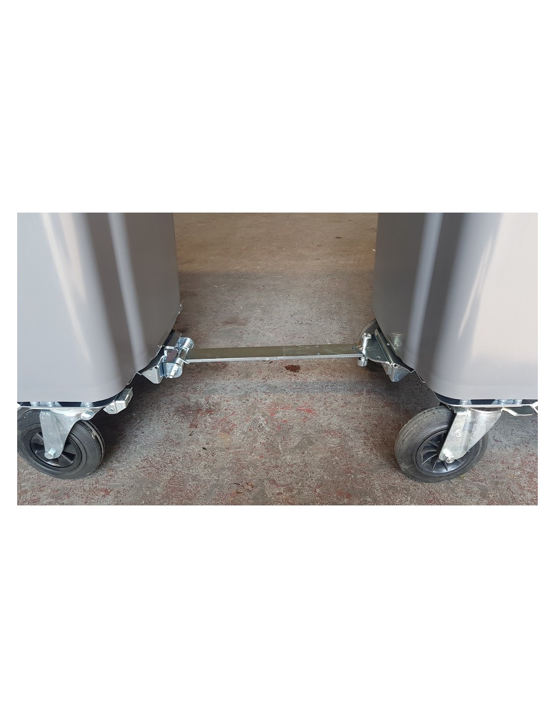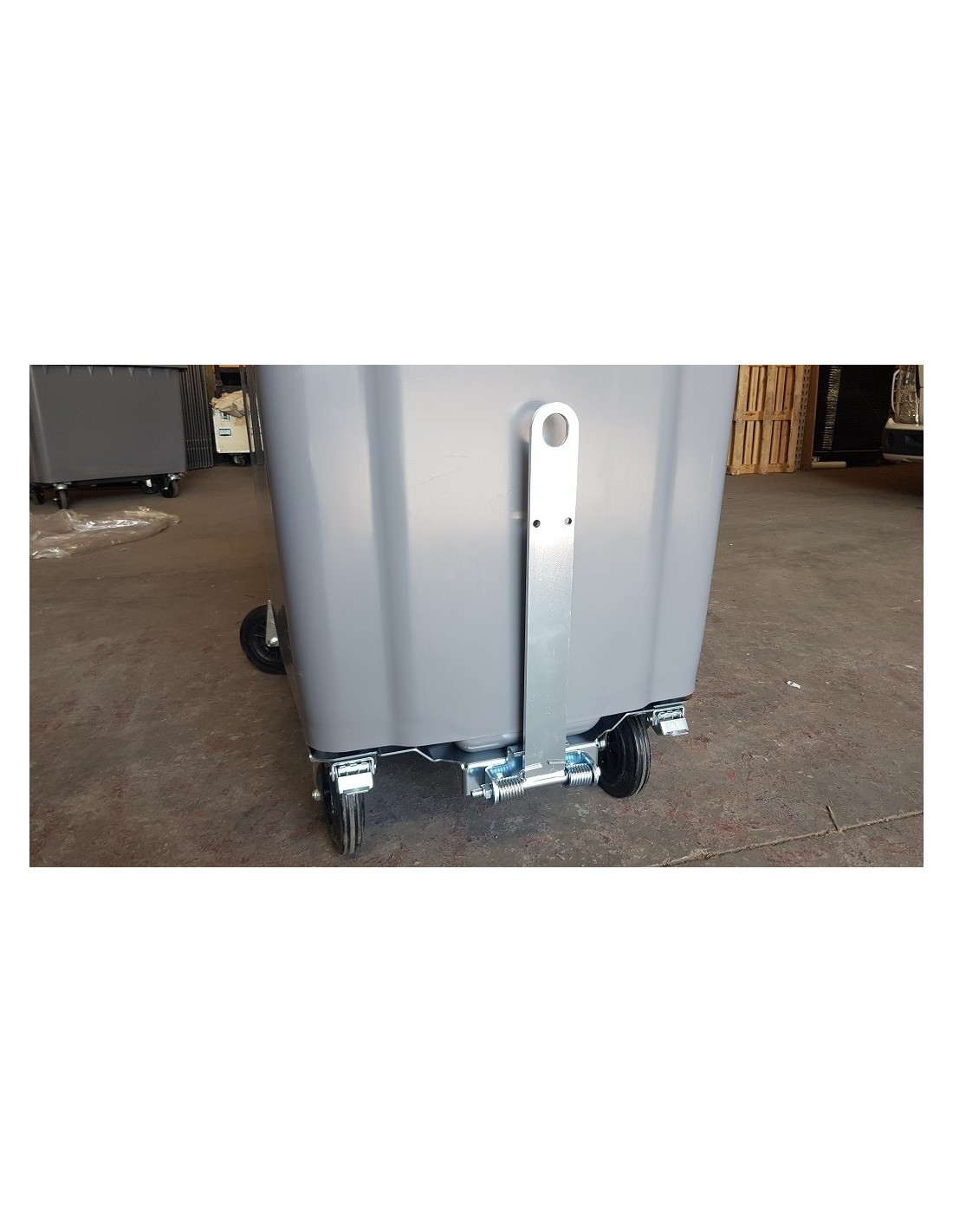Timon d'attelage pour conteneur à 4 roues . Ce timon permet d'accrocher jusqu'à 5 bacs roulants .